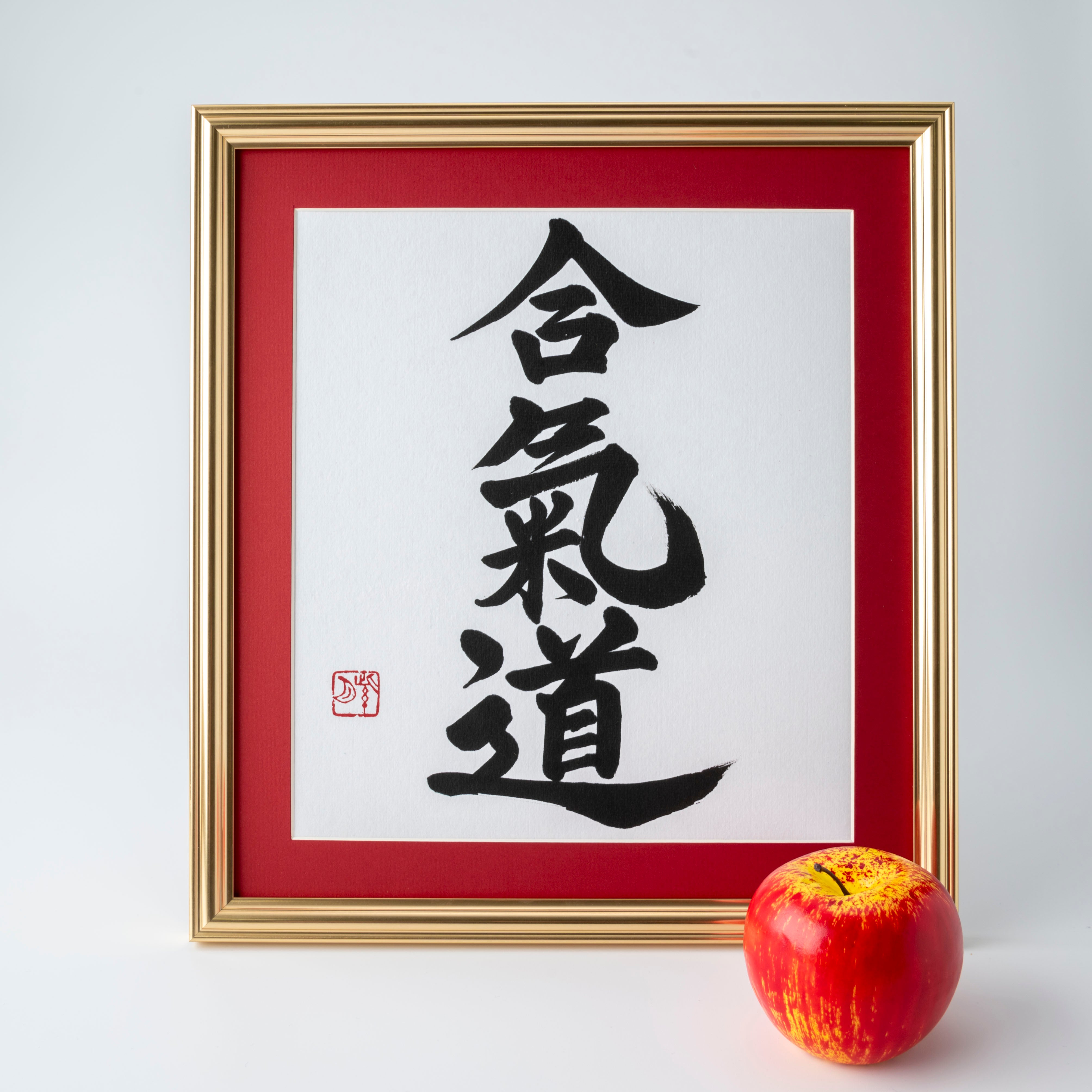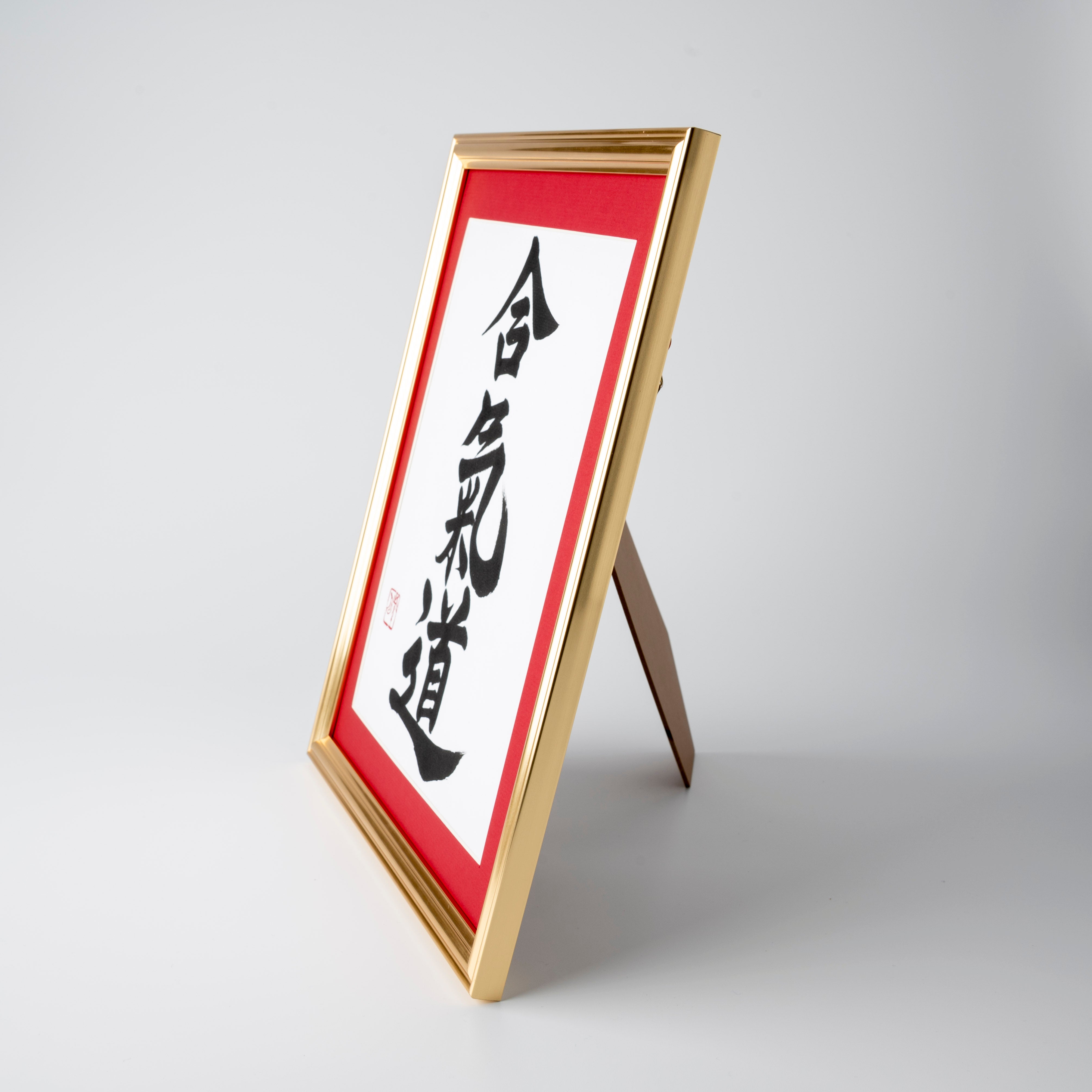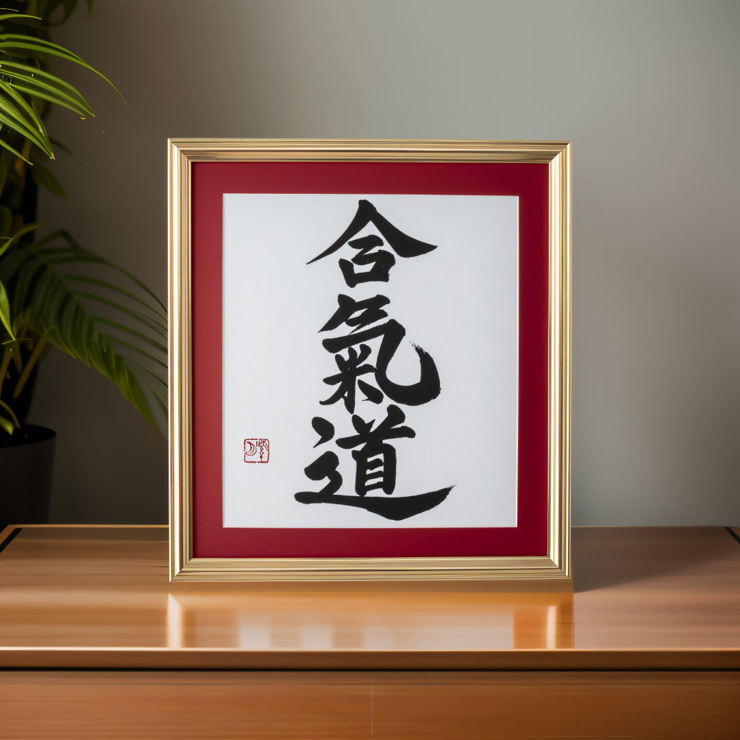 Quest'opera calligrafica incorniciata presenta la fiera frase 合気道 (Aikido). Incorpora la calma concentrazione, la forza interiore e la disciplina rispettosa che stanno al cuore dell'Aikido — qualità che guidano i praticanti nella vita quotidiana.