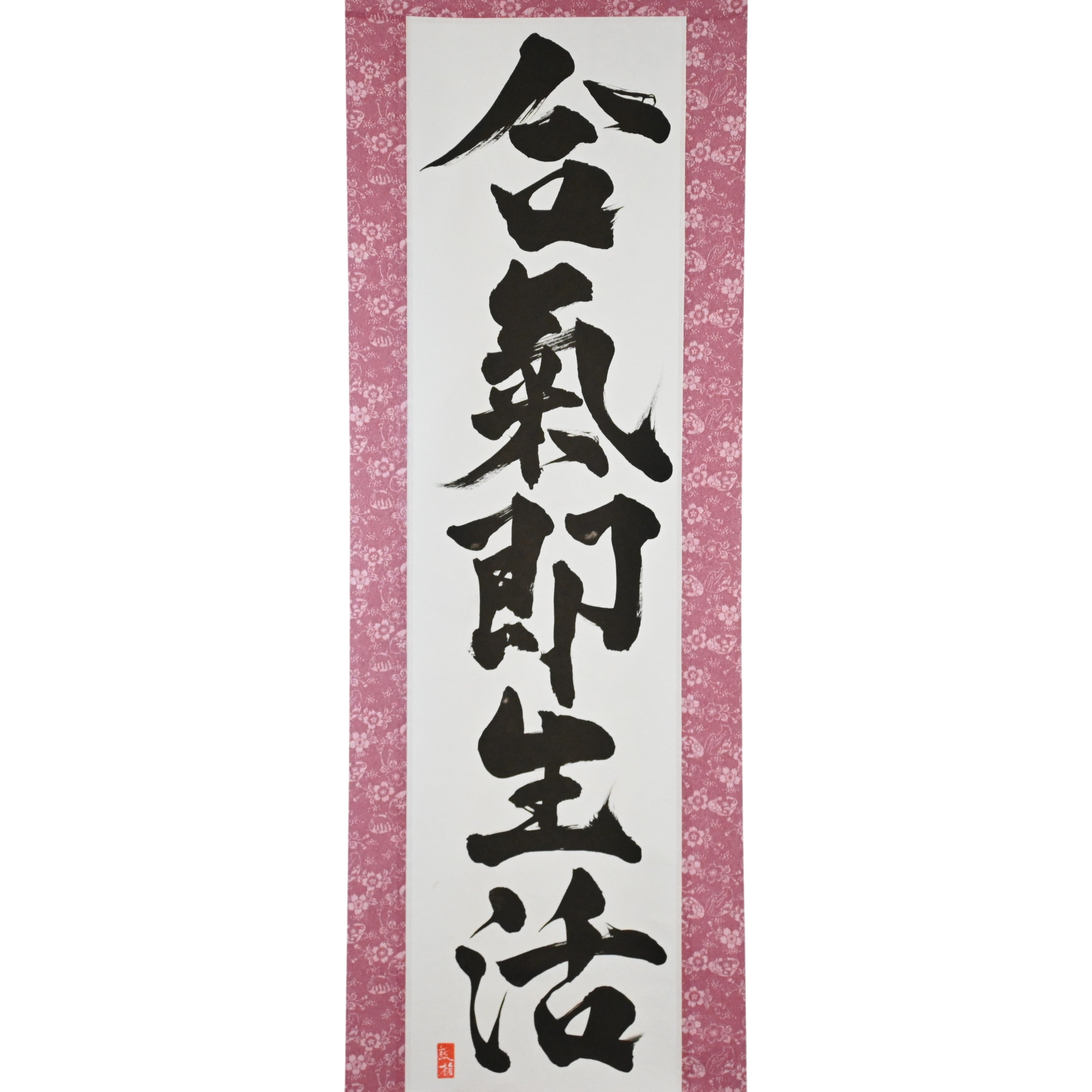 This Japanese calligraphy scroll features the profound phrase 合気即生活 (Aiki Soku Seikatsu) — "Aikido is daily life". It expresses a core principle of Aikido: the art is not confined to the dojo, but flows through every moment of our lives.