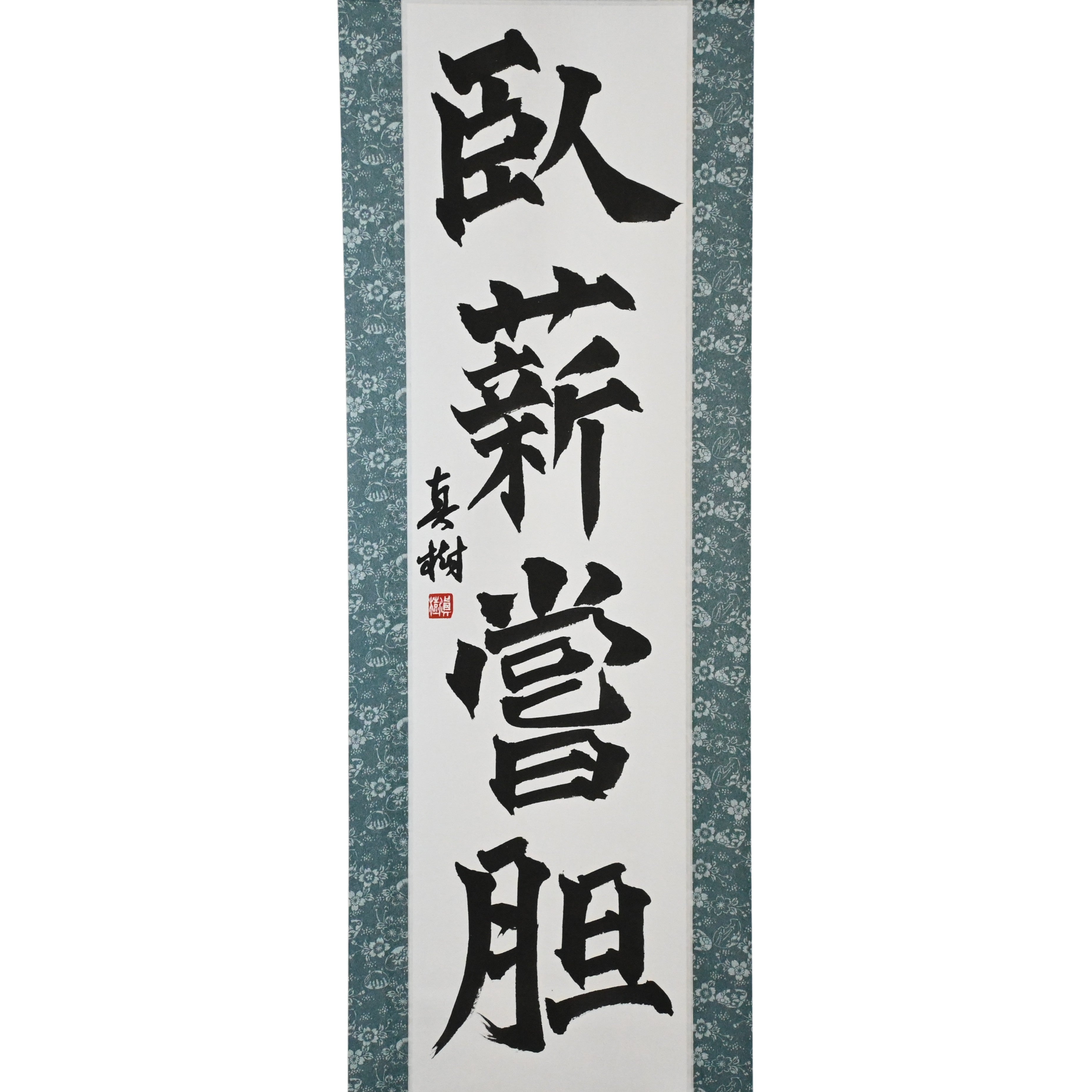 This Japanese calligraphy scroll features the powerful phrase 臥薪嘗胆 (Gashin Shōtan) — a timeless expression of patience, perseverance, and quiet determination on the samurai path.