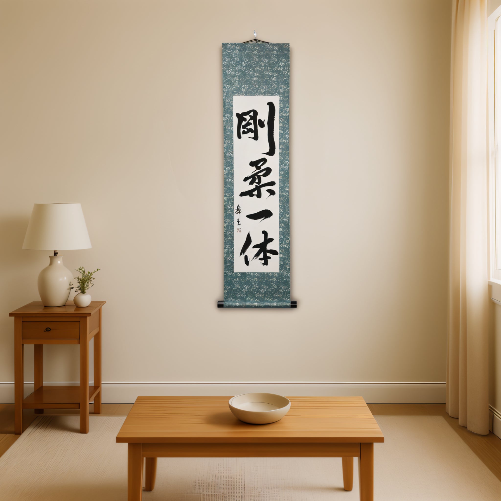 This Japanese calligraphy scroll features the phrase 剛柔一体 (Gōjū Ittai) — a profound concept that lies at the heart of Karate philosophy, especially in 剛柔流 (Gōjū-ryū), one of its most revered traditional styles.