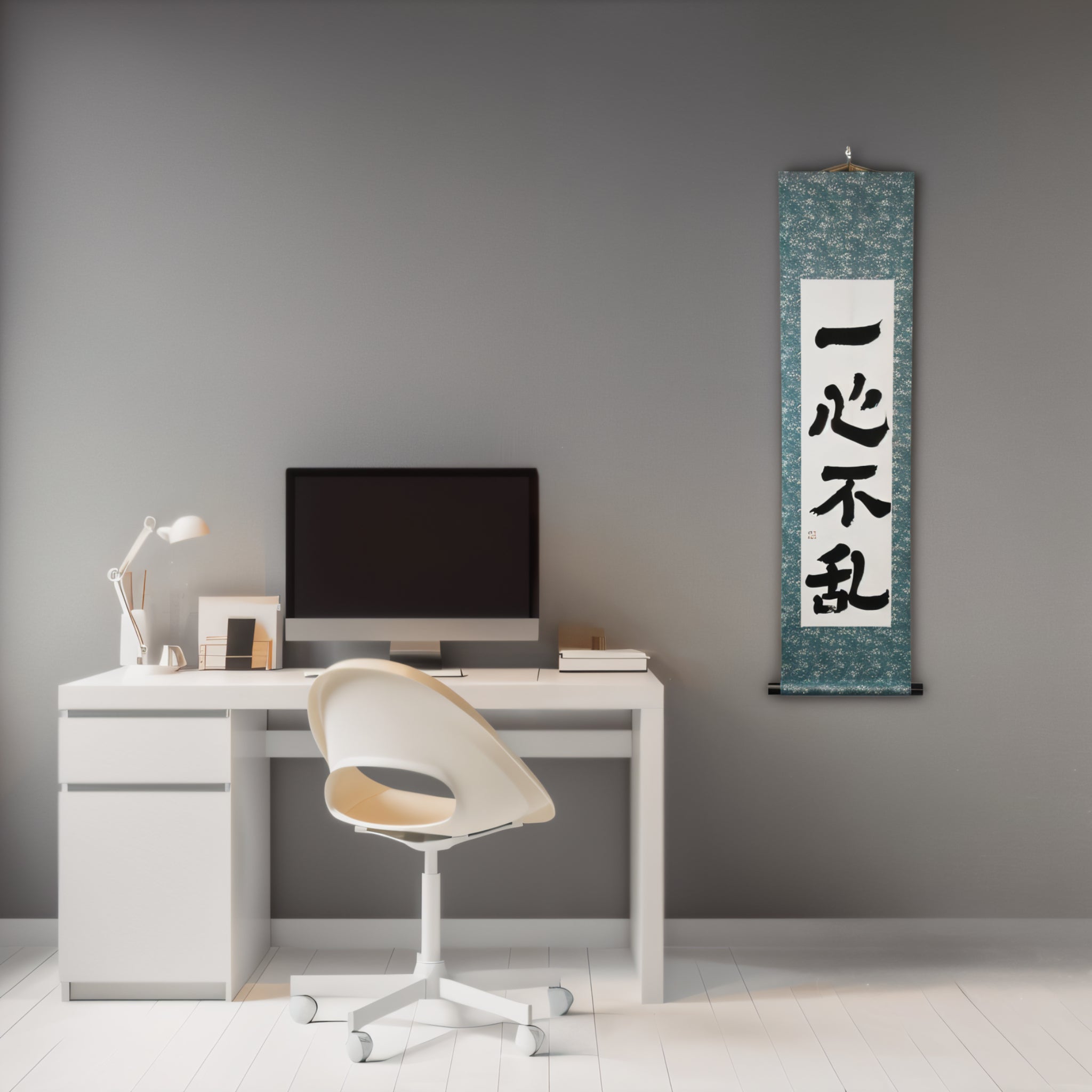 This Japanese calligraphy scroll showcases the powerful phrase 一心不乱 (Isshin Furan), meaning “undivided focus” or “with single-minded devotion”. It captures the essential mindset of martial arts — the ability to eliminate distractions and commit wholly to the moment.