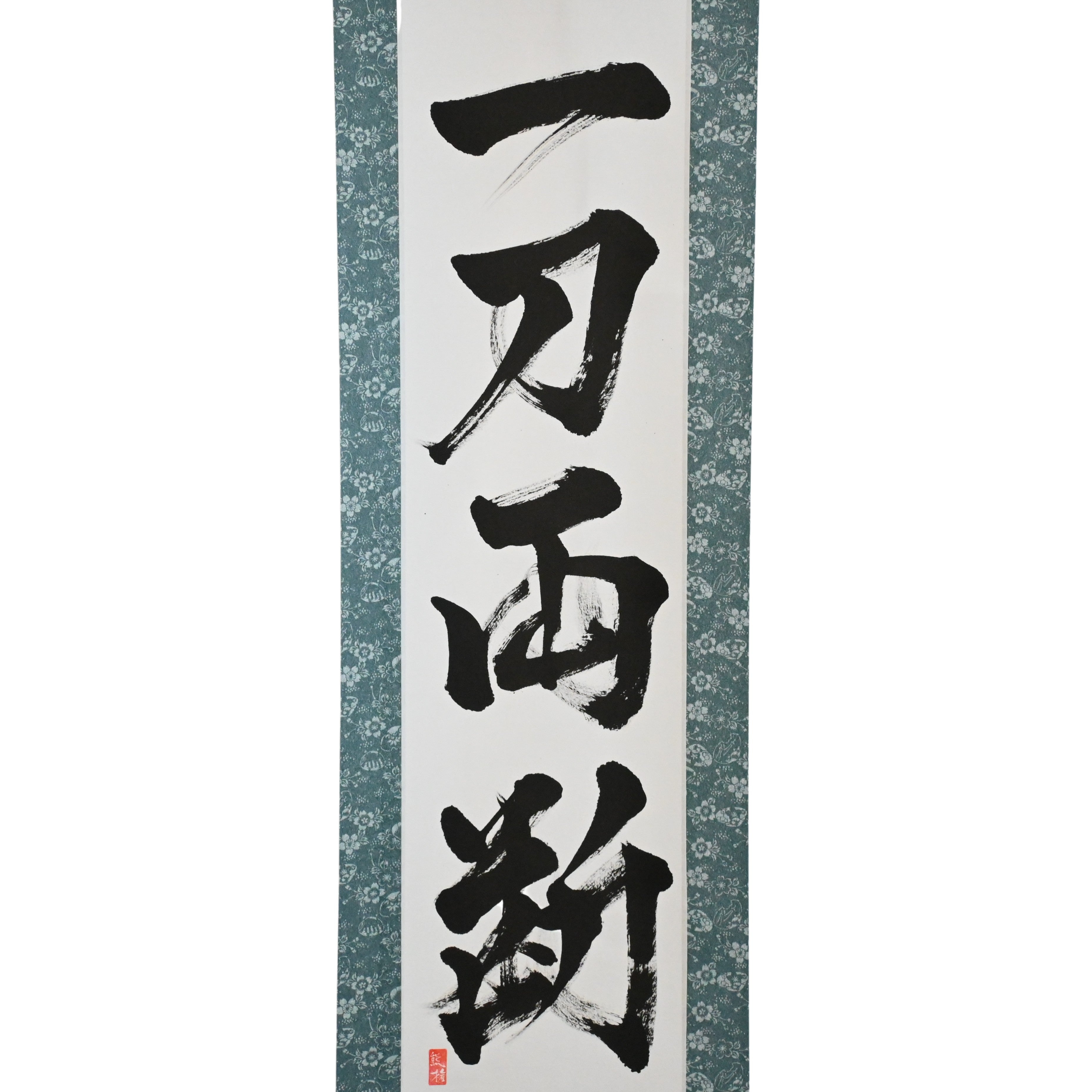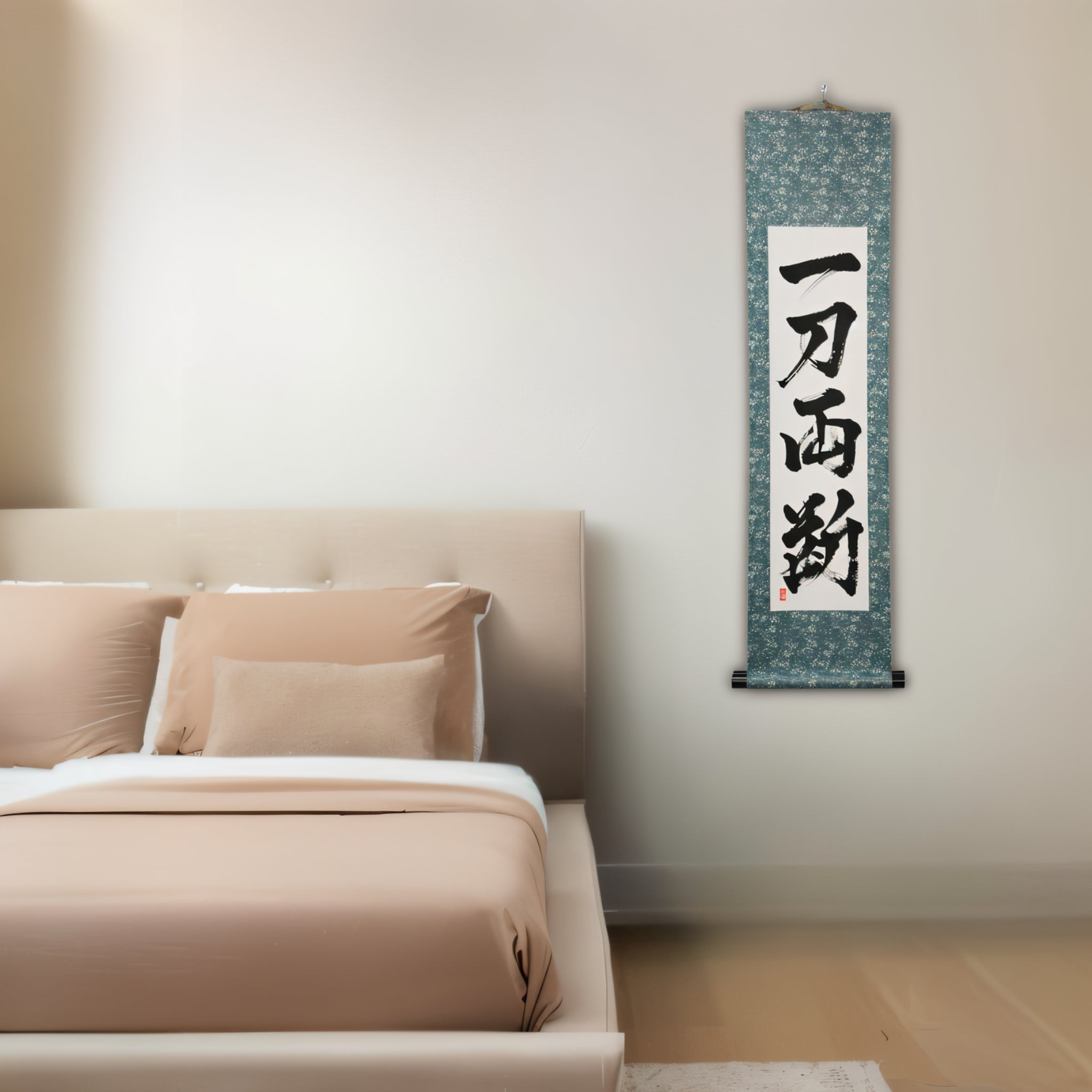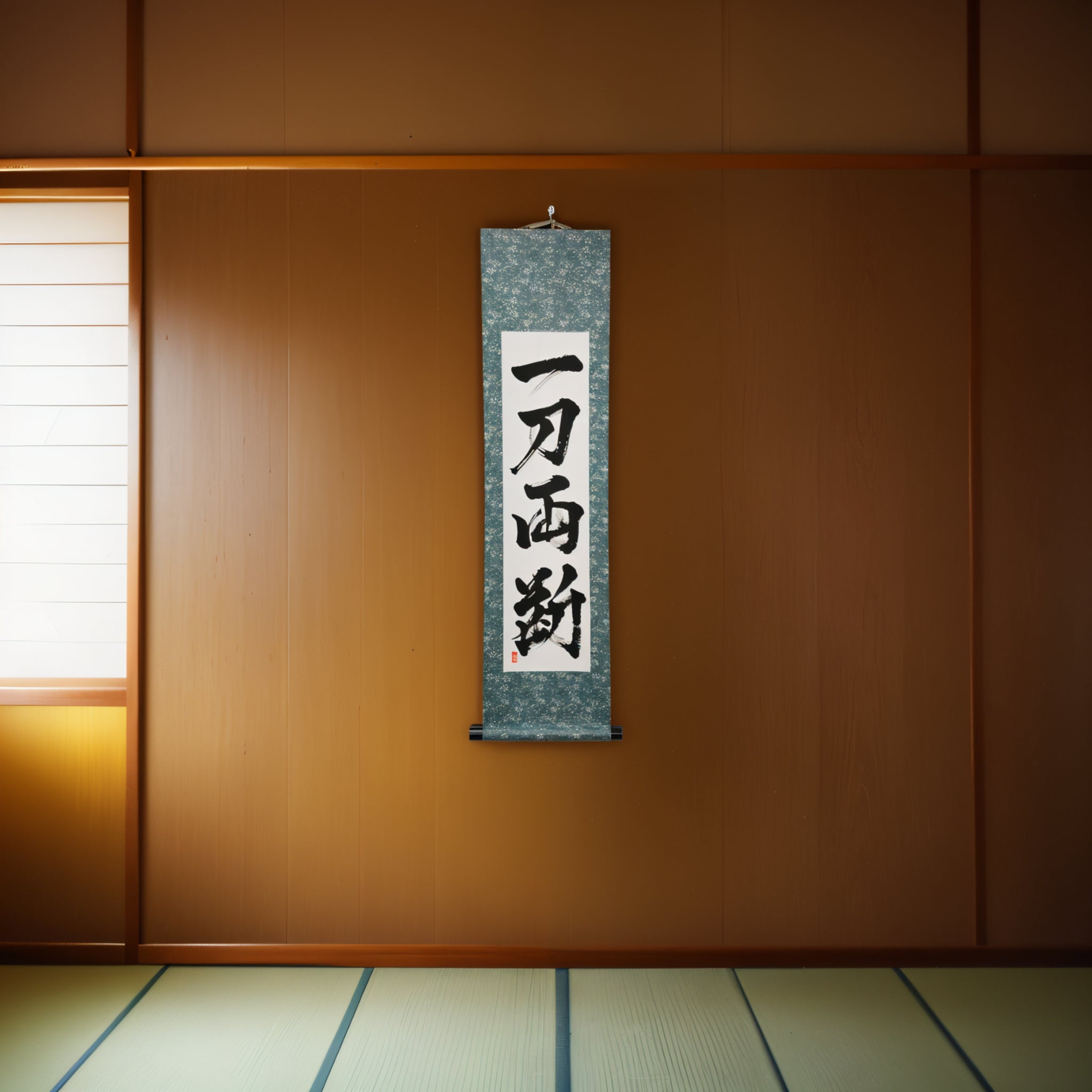 Este pergaminho de caligrafia japonesa exibe ousadamente a frase 一刀両断 (Ittō Ryōdan) — uma expressão poderosa que captura a determinação inabalável e a clareza do espírito samurai.
