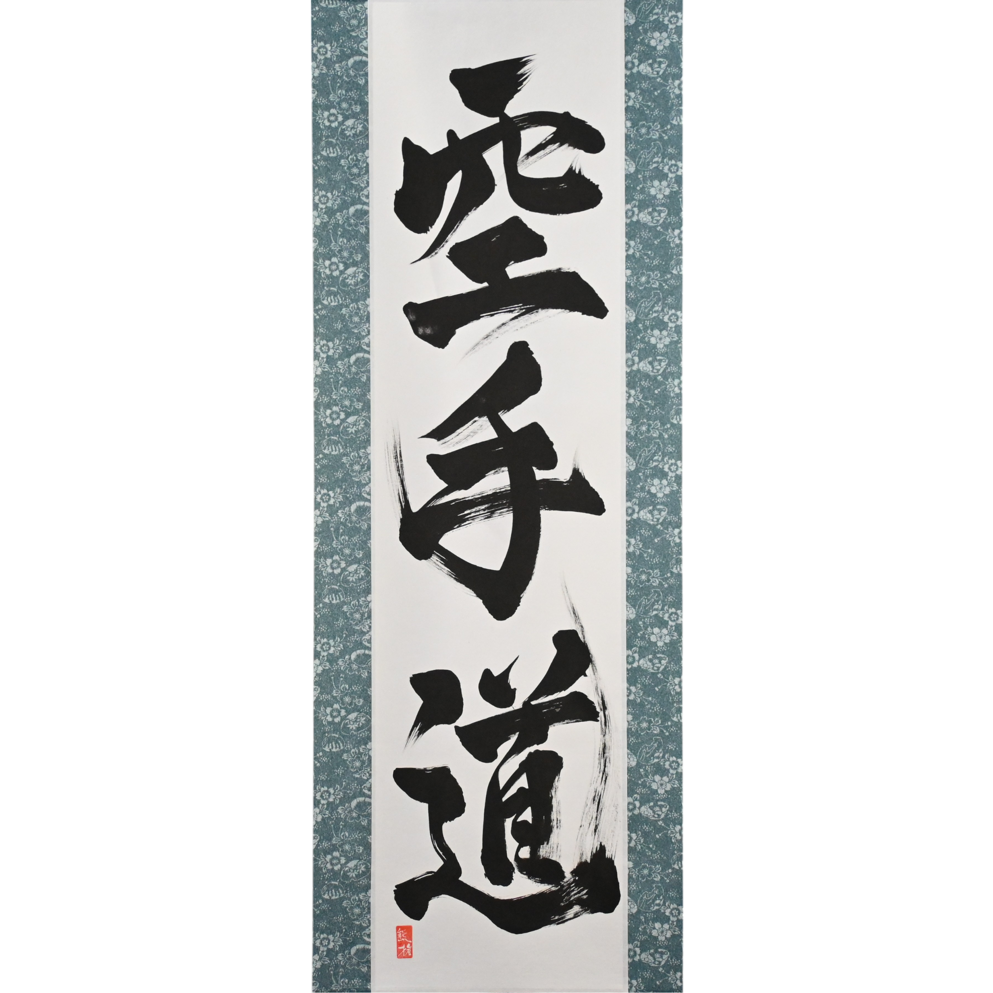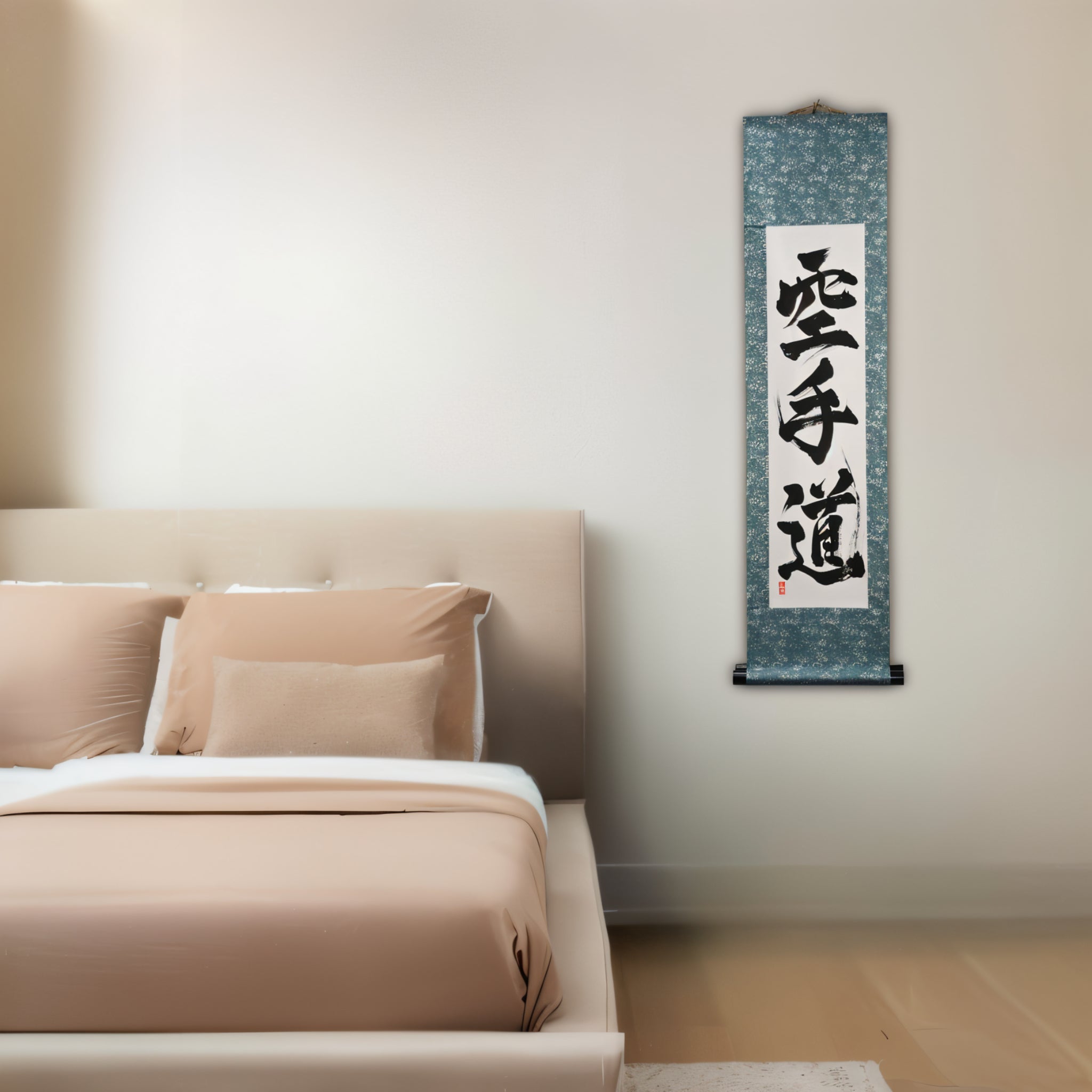 Este pergaminho de caligrafia apresenta a poderosa frase 空手道 (Karate-do) — não apenas uma arte marcial, mas uma jornada de vida de disciplina, respeito e força interior.