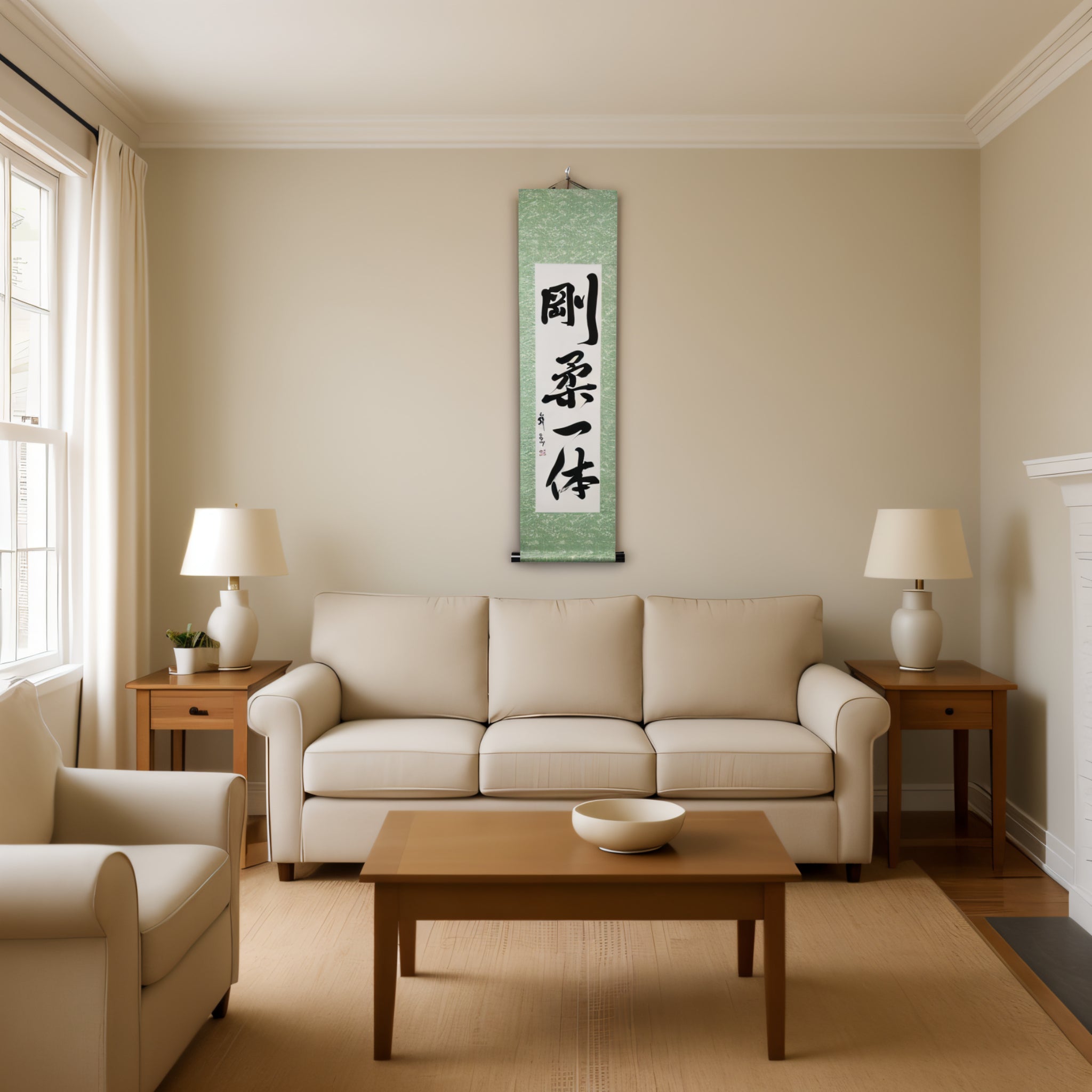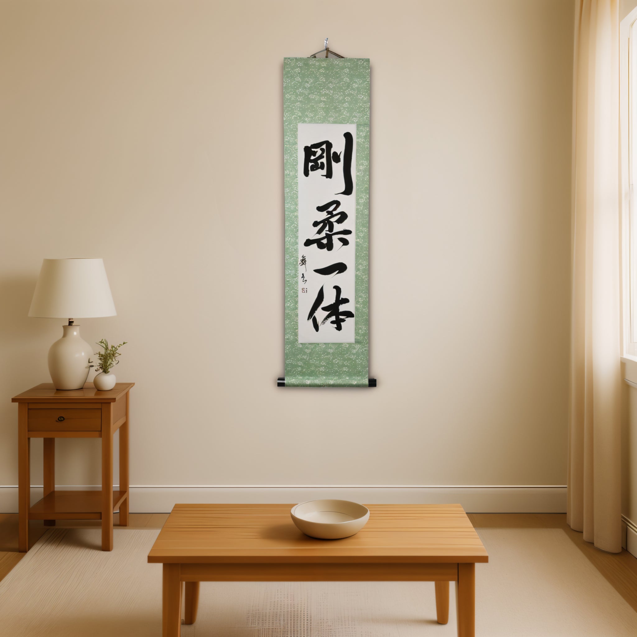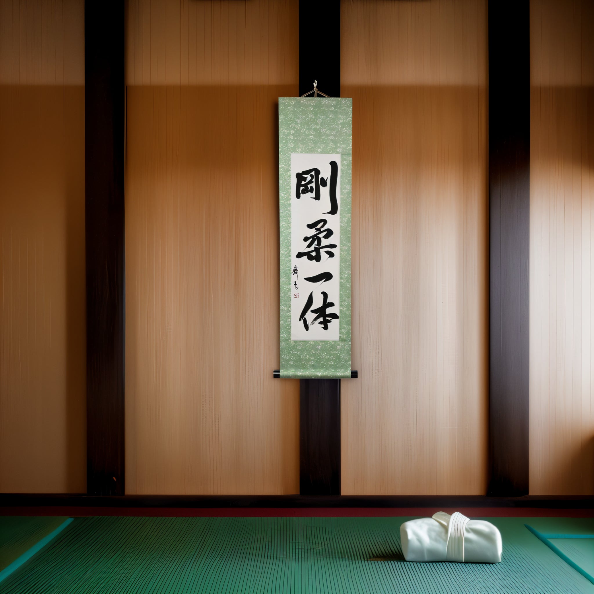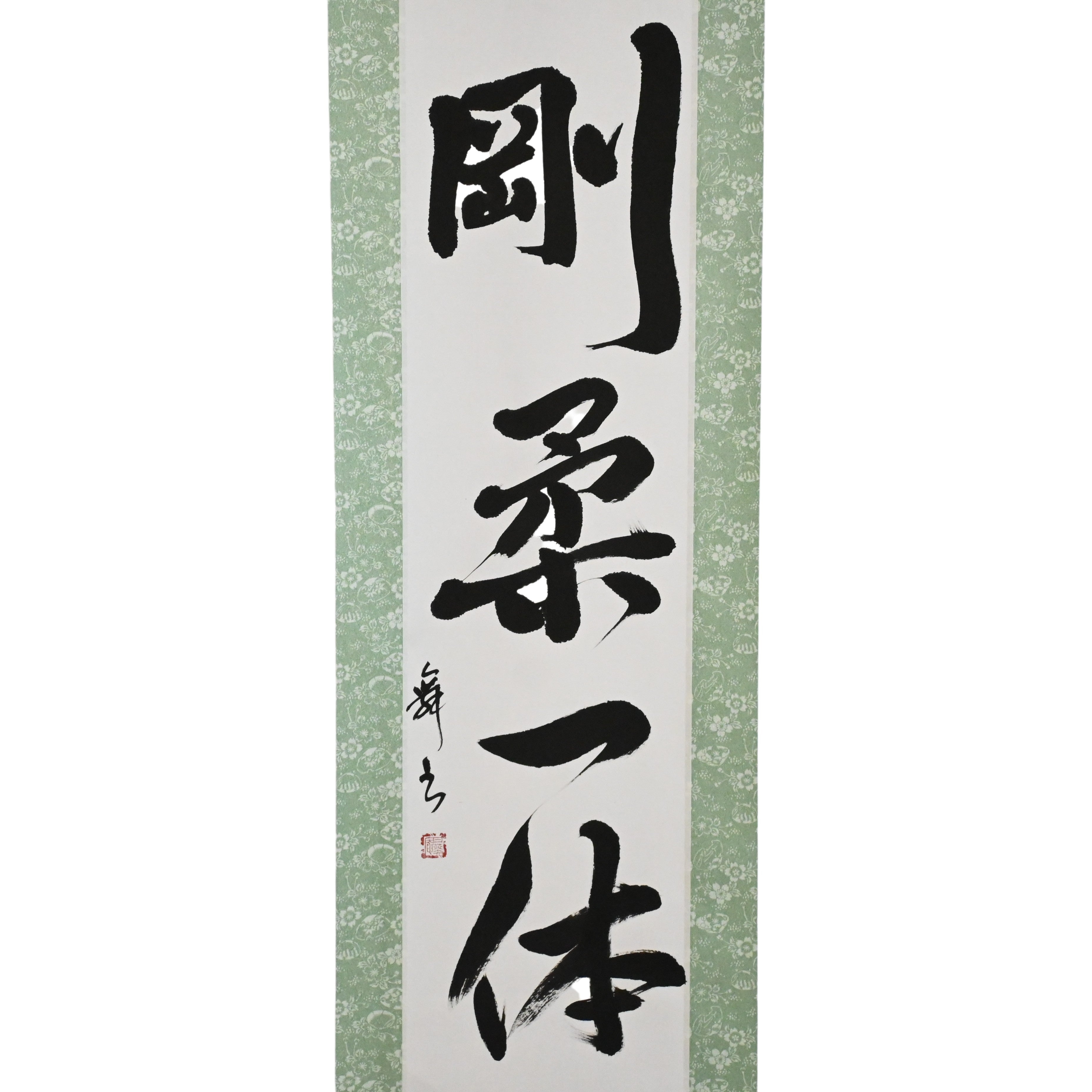 Este pergaminho de caligrafia japonesa apresenta a frase 剛柔一体 (Gōjū Ittai) — um conceito profundo que está no coração da filosofia do Karate, especialmente no 剛柔流 (Gōjū-ryū), um dos seus estilos tradicionais mais reverenciados.